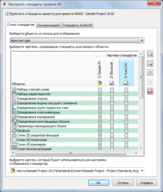 Для настройки стандартных стилей и графических параметров нужно определить один или более чертежей со стандартами проекта, в которых содержатся стандарты для стилей и графических параметров. Такие чертежи могут быть файлами DWG, DWT или DWS и добавляются в диалоговом окне настройки.