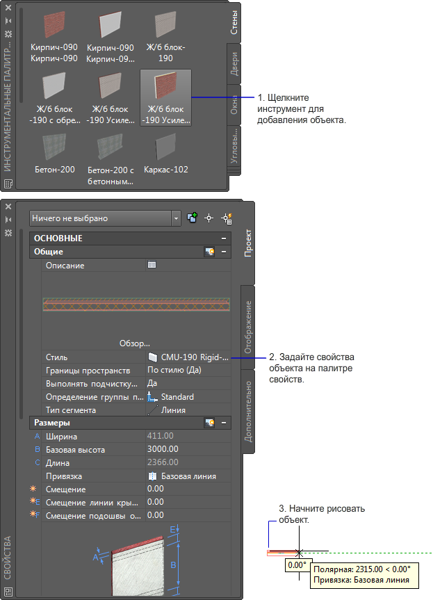 Инструменты, как правило, имеют предварительно установленные параметры создания, называемые свойствами. При щелчке на инструменте объекта для добавления объекта в чертеж открывается палитра свойств, с помощью которой можно при необходимости изменять свойства нового объекта. Если такой необходимости нет, можно просто поместить объект в чертеж.