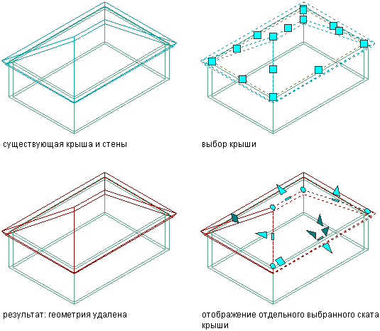 Эта процедура используется для преобразования граней существующей крыши в отдельные скаты со свойствами выбранного инструмента ската крыши. После этого можно отредактировать скаты крыши, а также их кромки по отдельности.
