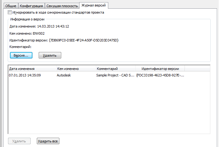 У каждого параметра представления в составе чертежа со стандартами проекта есть своя история версий. В истории версий представлены уникальный идентификатор версии, дата и время изменения, имя пользователя и любые дополнительные комментарии, введенные пользователями.