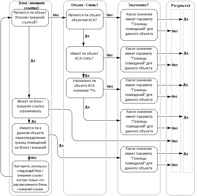 На схеме ниже показано, как значение параметра "Границы объектов", установленное для объекта границ, влияет на формирование ассоциативных пространств. Подробные инструкции по заданию свойства "Границы объектов" для объектов границ приведены в следующих разделах.