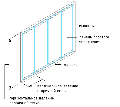 Можно иметь несколько определений для каждого типа элемента. Например, можно описать деление так, чтобы создать горизонтальную или вертикальную сетку, а можно описать ячейки таким образом, чтобы они содержали вложенную сетку либо дверную/оконную сборку. Чтобы облегчить повторное использование, можно сохранить определения элементов и затем назначать их сеткам, ячейкам, каркасам или импостам по мере необходимости.