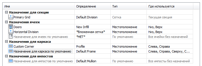 Задание различных определений каркасов оконной/дверной сборки