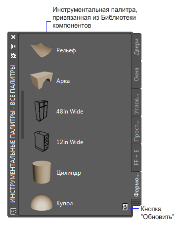 Если инструментальная палитра связана с набором инструментальных палитр из Библиотеки компонентов, внизу палитры отображается кнопка "Обновить".
