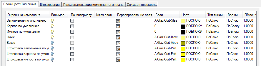 Данная процедура предназначена для того, чтобы задать свойства одной или нескольких секущих плоскостей для стиля блока витражей. Графические свойства секущей плоскости применяются только к таким экранным представлениям, как "План", которые используются на видах сверху (вид "План").
