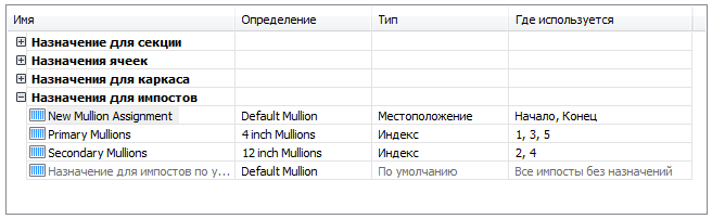 Новое назначение для импоста отображается в списке назначений для импостов.