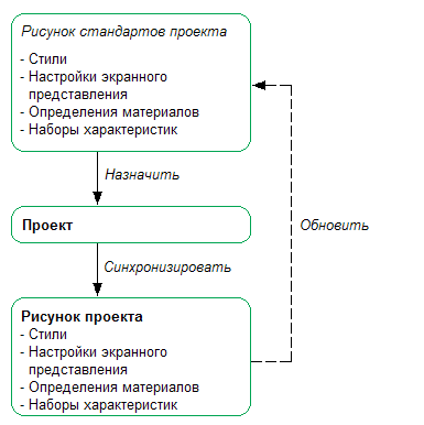 В любое время жизненного цикла проект можно сравнить со стандартами проекта, при наличии несоответствия версий между стандартами и чертежами проекта, проект синхронизируется со стандартами. Кроме того, при необходимости стандарты можно обновить из чертежей проекта.