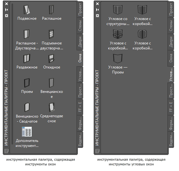 | пользовательские палитры инструментов, созданные администратором САПР | инструменты окна со стилями и свойствами окон, которые специально подготовлены для ваших проектов или в соответствии со стандартами проектной организации |