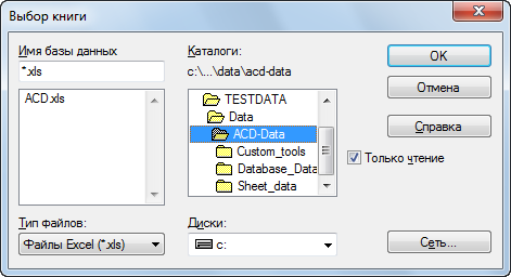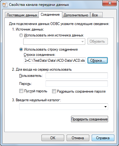 Файл Microsoft Excel, который вы выбрали в качестве источника данных, отображается в позиции "Строка подключения".