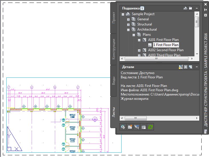 Вид листа представляет собой видовой экран пространства листа на листе, который создается при перетаскивании на лист чертежа вида или вида пространства модели с Палитры структуры проекта.