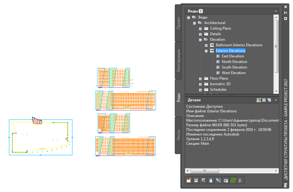 Чертеж вида создается путем выбора конструкций на Палитре структуры проекта и вставки их с помощью ссылок на чертеж вида. При создании видов для нескольких уровней каждая конструкция вставляется с учетом относительной высоты уровня, тогда как самый нижний уровень вставляется при Z = 0.