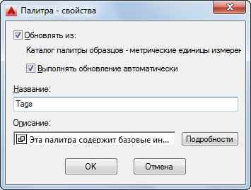 Надпись под окошком метки представляет собой имя каталога Библиотеки компонентов, где обновляется данная палитра.