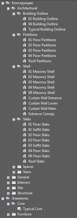 Диспетчер чертежей отображает дерево, общее для вкладок "Конструкции", "Виды" и "Листы" Диспетчера структуры проекта. В нем выполняется систематизация файлов чертежей. В каждой вкладке Диспетчера структуры проекта (кроме вкладки "Проект") имеется дерево Диспетчера чертежей, на котором отображаются относящиеся к проекту файлы: элементы, конструкции, виды и листы.