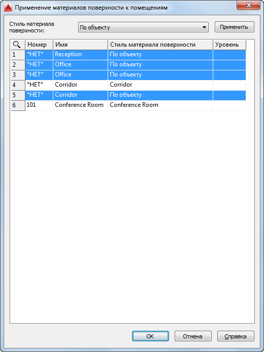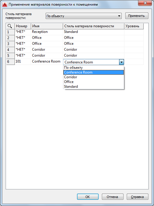 Все пространства на чертеже перечислены в диалоговом окне с информацией о номере, имени и уровне. Можно редактировать информацию, касающуюся только стиля материалов поверхности.