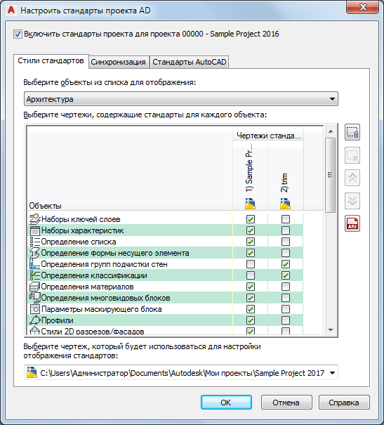 Можно синхронизировать различные части проекта. Можно выполнять синхронизацию всего проекта, отдельных чертежей проекта или отдельных стилей или графических свойств.