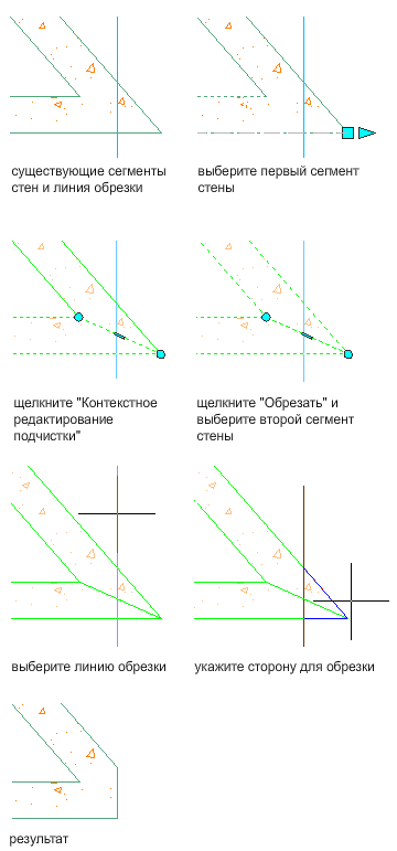Данная процедура применяется для редактирования пересечения стен путем обрезки компонента. Границей обрезки может служить линия, дуга, окружность, полилиния или кромка компонента стены.