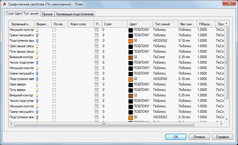 Задание экранных свойств компонентов лестницы в зависимости от их расположения относительно отметки плоскости сечения