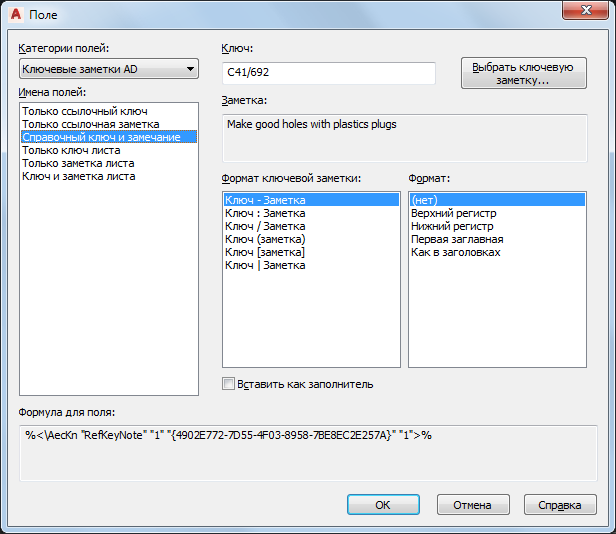 вставить поле ключа в текстовый элемент, см. раздел "Вставка полей в текст AutoCAD".
