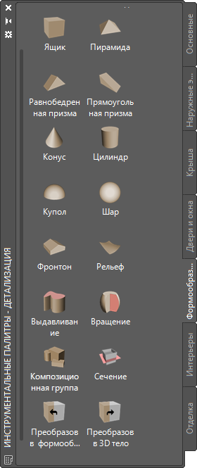Средства AutoCAD Architecture дают возможность быстро размещать формообразующие элементы, используя различные инструменты формообразования, обладающие определенными свойствами стиля и прочими стандартными параметрами. Можно использовать инструмент с назначенными по умолчанию параметрами, а можно изменять свойства, не зависящие от стиля. Инструменты формообразования можно использовать также для создания новых формообразующих элементов путем применения свойств инструментов к существующим 3D телам.