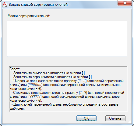 - В диалоговом окне "Задать способ сортировки ключей" введите маску сортировки ключей для каждого шаблона ключей в выбранной базе данных. Для каждой маски используйте отдельную строку.