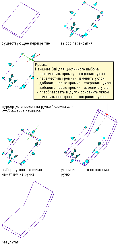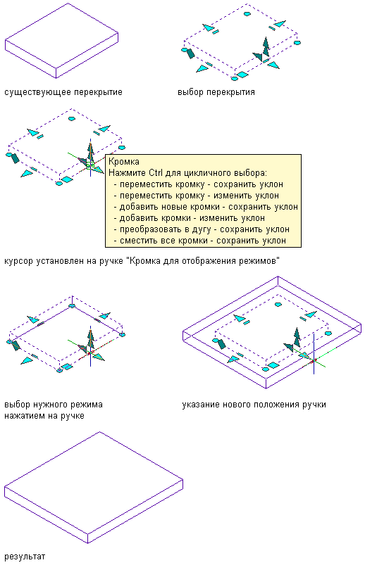 Ручки кромки позволяют изменять размер, форму или наклон выбранного перекрытия или ската крыши посредством перемещения одной кромки за один раз. При наведении курсора на ручку кромки появляется подсказка с перечислением доступных режимов редактирования (описания режимов представлены после следующей процедуры). После нажатия на ручку кромки переключение между режимами осуществляется нажатием клавиши Ctrl.