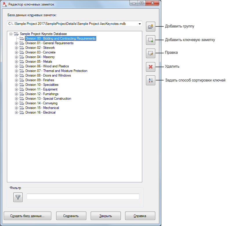 Редактор ключевых заметок - это автономное приложение, позволяющие пользователю создавать и редактировать базы данных ключевых заметок. Диалоговое окно "Редактор ключевых заметок", доступ к которому осуществляется через меню Диспетчера оформления, содержит иерархическое дерево выбранной на текущий момент базы данных, отображаемой в виде корневого узла. Для существующей базы данных можно развернуть корневой узел с целью отображения групп, а затем развернуть узлы групп, чтобы отобразить подгруппы или отдельные ключевые заметки. Кроме того, можно ввести текст в поле "Фильтр" под иерархическим представлением. Нажатие кнопки "Фильтр", клавиш TAB или Enter приводит к развертыванию всех узлов, вложенных в узел, имя которого содержит текст, введенный пользователем.