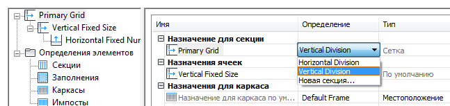 Секции определяют ориентацию сетки (горизонтальное или вертикальное направление ячеек сетки и импостов) и тип секции (количество и размер ячеек).