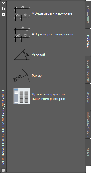 Палитра инструментов содержит инструментальные средства AD-размеров