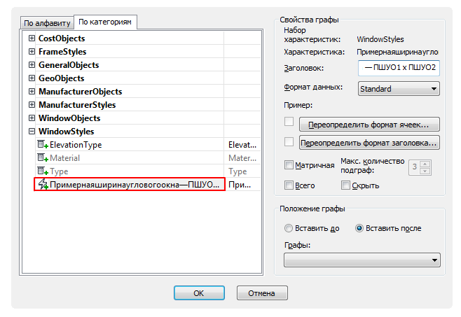 8. В диалоговом окне "Добавление графы" в области "Стили окон" выберите "Примерная ширина углового проема ПШУП1 х ПШУП2".