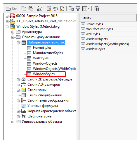 6. Последовательно раскройте элементы "Спецификация" и "Стиль" и выберите "Спецификация окон".
