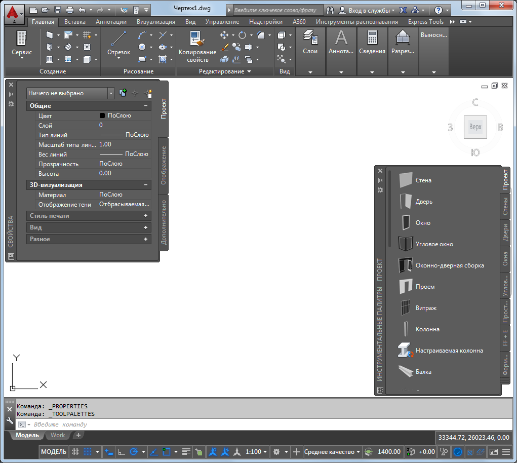 Конфигурация по умолчанию для рабочего пространства AutoCAD Architecture