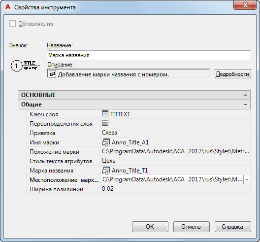 Свойства инструмента обозначения названия
