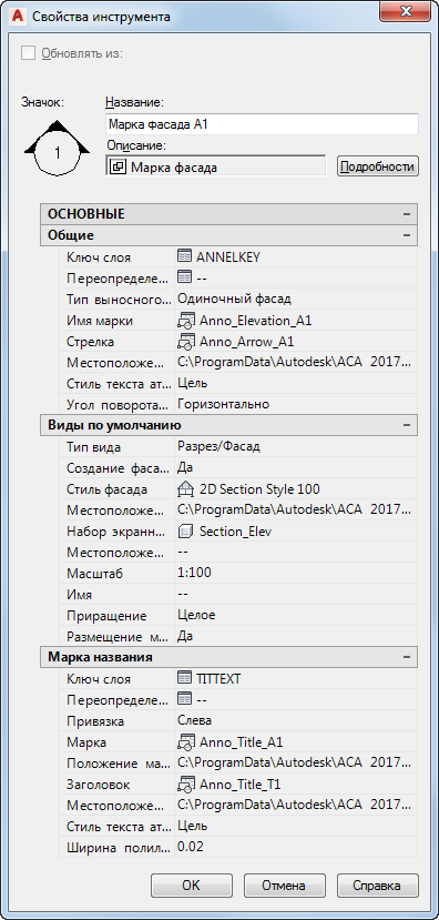 | Стрелка | Разрез/фасад | Задается блок для стрелки обозначения разреза/фасада. |