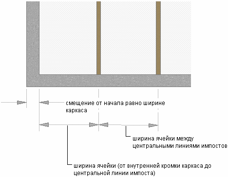 | начальной точкой базовой линии оконной/дверной сборки и начальной гранью первой ячейки горизонтальной сетки, | введите значение в поле "Смещение в начале". |
