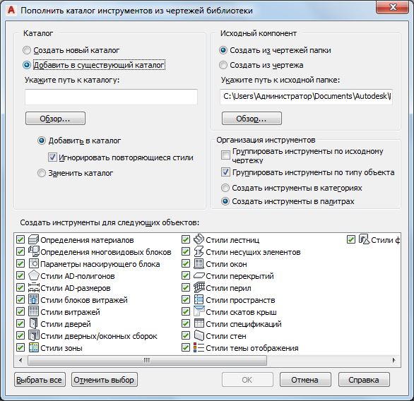 Прим.: Если включены обе опции, содержимое каталога сначала группируется в соответствии с чертежами, а затем в соответствии с типом объекта, категории генерируются из чертежей, а палитры - из типов объектов. Такой вариант используется, поскольку палитры не могут быть вложенными. В данном случае переключатели для категорий и палитр отключены, включен переключатель "Создать инструменты по палитрам".