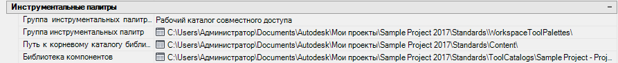Если выбран "Рабочий каталог совместного доступа", путь, выбранный для параметра "Группа инструментальных палитр", добавляется в пользовательский профиль проекта (AWS), и каталог инструментов открывается в указанной папке. Если выбран "Индивидуальный рабочий каталог", папка создается внутри папки C:\My Documents\Autodesk\My Projects\<project name>, и инструментальные палитры копируются в эту папку. Если выбрать значение "Нет" группа инструментальных палитр для данного проекта не используется, и другие свойства в категории "Инструментальные палитры" не отображаются.