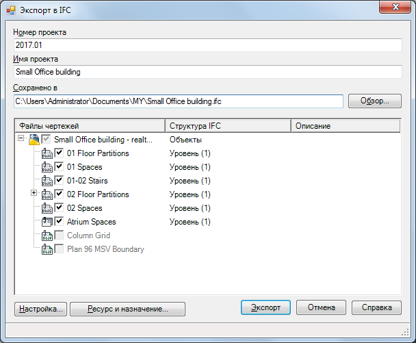 Данная процедура используется для экспорта чертежа как файла IFC и включения в него выбранных внешних ссылок. При экспорте необходимо активизировать соответствующий чертеж. Он по умолчанию сопоставляется с (Ifc)Site.
