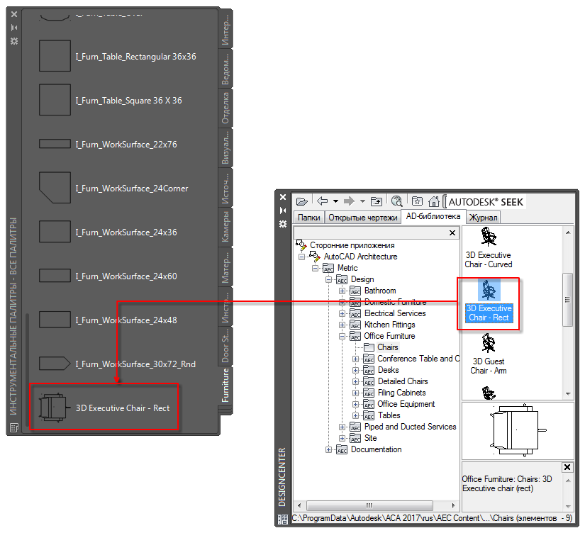 Элементы AD-библиотеки можно перетаскивать из папки Центра управления в палитру инструментов.