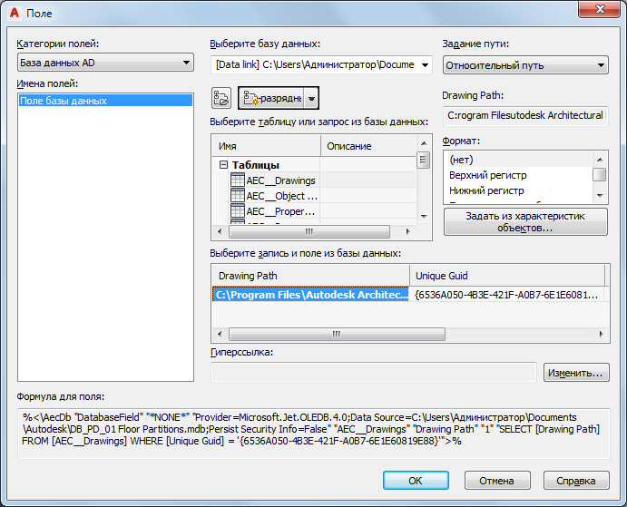 | вставить поле базы данных в описание атрибута, | см. раздел "Вставка полей в атрибуты AutoCAD". |