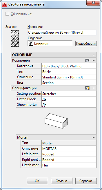 Внешний вид таблицы "Свойства инструмента" меняется в зависимости от типа компонента и текущей конфигурации параметров свойств. На следующем чертеже показаны две конфигурации таблицы "Свойства инструмента" для инструмента "04 - Кладка", входящего в образец базовой палитры инструментов. В обоих случаях инструмент настроен на добавление стандартных соединенных кирпичей размером 3/8 дюйма, но в первой конфигурации для "Вида" установлено значение "В разрезе", тогда как во второй - "Фасад" (по образцу)". Для компонентов деталей, которые в разных видах могут быть сориентированы по-разному, значение свойства "Вид" задает конкретную процедуру выполнения чертежа, используемую для вставки изображения в чертеж. Отметим, что при различных значениях "Вида" отображения ориентации в таблице будут различны. Отметим также, что спецификации раствора не применяются к параметрам вида "Фасад" (по образцу)" и в соответствующей конфигурации не отображаются. Свойства, отображаемые под "Спецификациями", также зависят от других параметров. Например, если параметр "Отобразить свойства раствора" установлен на "Нет", а "Вид" установлен на "В разрезе", то никакие другие свойства раствора не отображаются. К некоторым компонентам деталей "Спецификации" не применимы, и заголовок на экране не появляется.