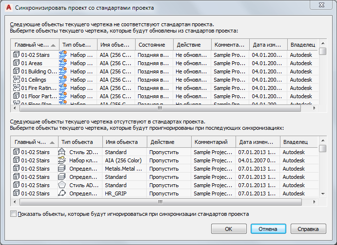 В этом случае во время последующих синхронизаций нестандартизированный объект не будет отображаться в списке, если только не установлен флажок "Показать объекты, которые будут игнорироваться при синхронизации стандартов проекта" или в Диспетчере стилей или Диспетчере экранных представлений снят флажок "Игнорировать" для параметра стиля или отображения, как указано в разделе "Исключение стилей и параметров отображения из синхронизации".
