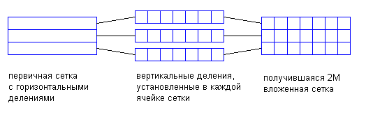 Вложение сеток начинают с первичной сетки. Любая ячейка первичной сетки может быть заполнена другой сеткой. Например, если первичная сетка имеет горизонтальное направление и содержит три ячейки, можно вложить вертикальную сетку в каждую горизонтальную ячейку и создать простую двухмерную (2D) сетку. Это называется конфигурацией вложений для стандартного стиля витража.