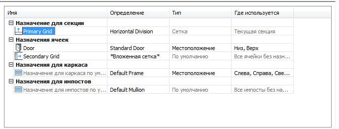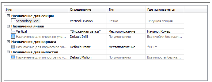 определения вложенных сетки можно составить, пользуясь вкладкой "Правила проектирования" диалогового окна "Свойства стилей витража". Список сеток дан в левой секции окна в виде дерева. Одна первичная сетка существует всегда. В первичной сетке может быть одна или несколько вторичных сеток. Вторичная сетка может содержать одну или несколько третичных сеток, и т.д.