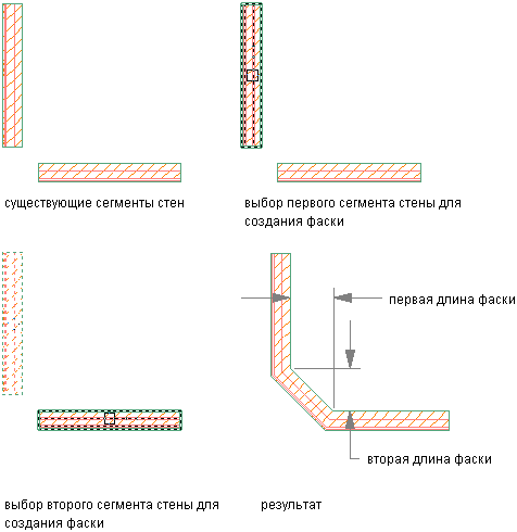 Перед тем, как приступать к операции соединения кромок, убедитесь в том, что стены имеют один и тот же стиль и одинаковую привязку к базовой линии. Во время выполнения соединения стен фаской могут появиться значки подсказок решения, если эти условия не одинаковы для каждой стены.