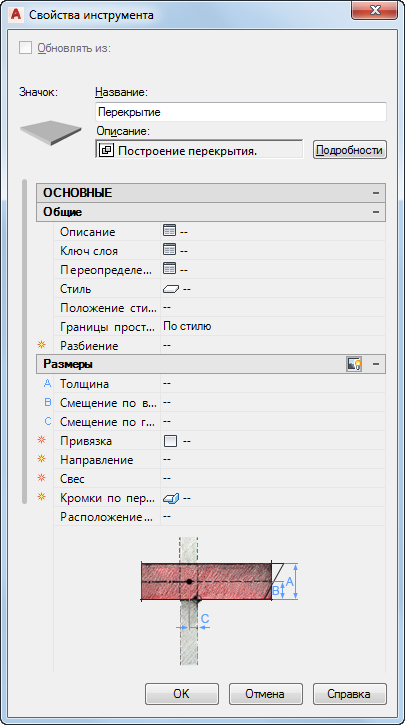 Прим.: Стили кромок перекрытий не могут применяться как часть определения стиля перекрытий; вместо этого их можно применять как свойство инструмента палитры. Многие стили перекрытий, включенные в файлы образцов содержимого, которые поставляются вместе с AutoCAD Architecture, указывают в своих именах определенный стиль кромок перекрытий. Если на основе данных стилей создается инструмент, стиль перекрытий уже назначен свойствам инструмента. Данные стили использовались в ранних версиях программы, в которых принятые по умолчанию стили кромок перекрытий можно было назначить стилю перекрытий. Данная возможность была удалена из пользовательского интерфейса Редактора стилей перекрытий, однако свойства стилей в упомянутых образцах стилей сохранились.