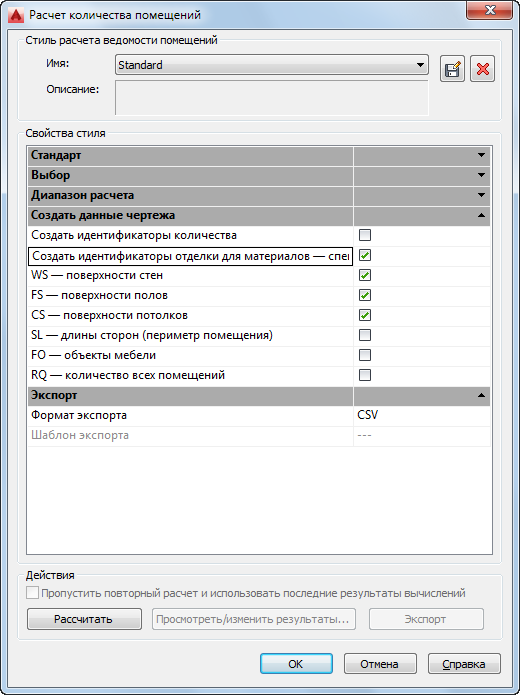 - В диалоговом окне "Расчет количественных характеристик помещения" в разделе "Свойства стиля" в списке "Создать данные чертежа" выберите "Создать идентификаторы отделки для каждого материала".