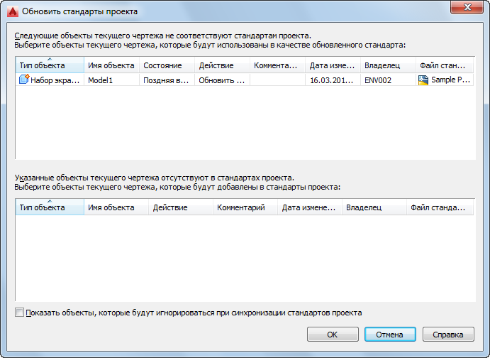 В таком случае элемент не будет отображаться во время последующих обновлений, если не будет установлен флажок "Показать объекты, которые назначено игнорировать во время синхронизации стандартов проекта", или если в Диспетчере экранных представлений для параметра представления будет снят флажок "Игнорировать".