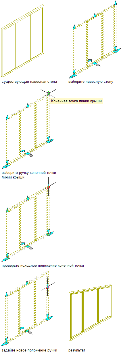 Данная процедура предназначена для того, чтобы изменить высоту или форму линии крыши и подошвы с помощью ручек.