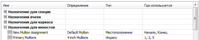 Новое назначение для импостов отображается в списке назначений для импостов.