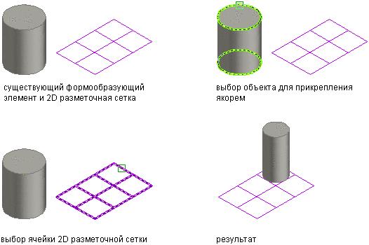 Прим.: Нет правила, которое бы определяло, к какому планировочному элементу прикрепится объект при креплении его якорем. Можно включить экранный компонент "Узлы", чтобы отображать узлы планировочных элементов разметочной сетки или объема для облегчения выбора ячеек. Также можно переместить объект после того, как он будет прикреплен якорем к разметочной сетке или объему.